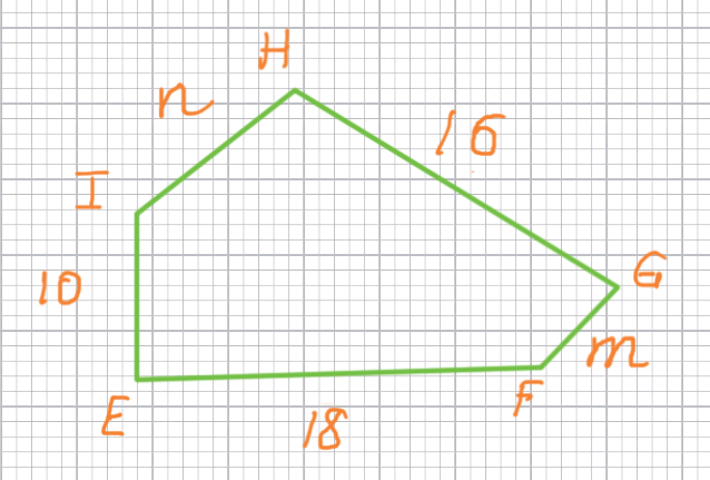 The figure below shows a pentagon EFGHI with sides lengths as shown. If the perimeter of the pentagon is 62, what is the value of m + n?